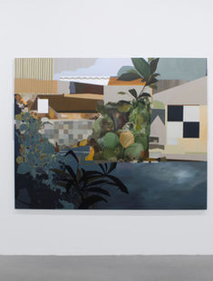 We also perceive that this collage-like gesture has become decisively incorporated into the artist’s pictorial practice, shifting his palette and opening space to new signs. Tropical colour, once vibrant at high frequency, has given way to deeper greens and earthy tones, as though absorbing the London mist and the hazier rhythm of the new landscape. The tropical fruits that emerge amid organic planes become signs of identity and belonging, echoes of a living origin, even at a distance.